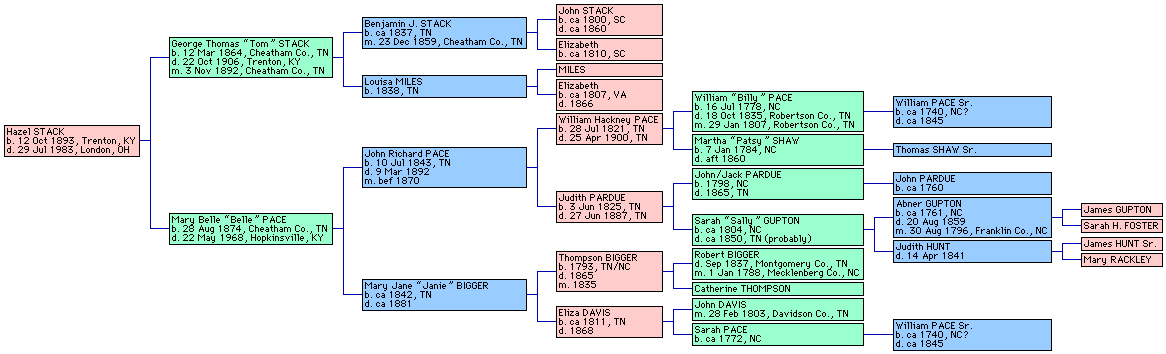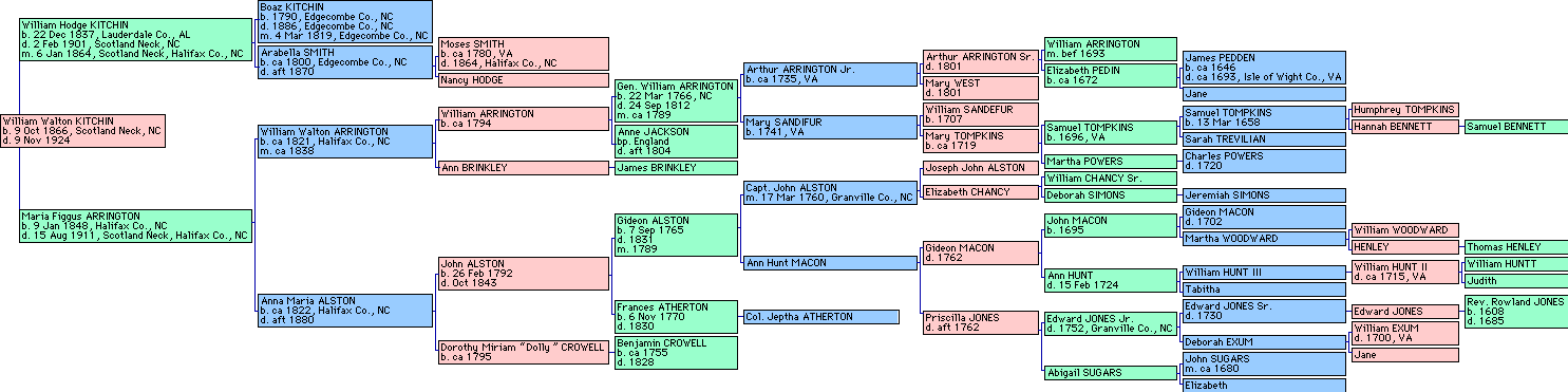 This site describes the families of my ancestors. If you want more information, or can contribute information or corrections, please e-mail me. This section contains links to six family charts; the major surnames in the charts are listed below. These charts have no links...use your browser to return back to this page. The BACON Ancestor Chart outlines families from eastern Virginia, and Kentucky (Todd Co.).Families include BACON, DICKINSON, WARE, HARRIS, ANDERSON, SANDIDGE, BOXLEY, BULLOCK, OVERTON, EDLOE, THORNTON, & TALIAFERRO.A few of these lines go back to England. Also included in this chart are two families from Connecticut who moved to Elmira, Chemung Co., NY: WELLES, and BABCOCK. The GRADY Ancestor Chart outlines families from Virginia (Dinwiddie Co.) and North Carolina (Duplin Co.).Families include GRADY, FITTZ, OUTLAW, BARROW, ALDRIDGE, THOMAS, BARFIELD, WHITFIELD, LAWRENCE, & DAFNELL. The LAWRENCE line goes back to England. The KITCHIN Ancestor Chart outlines families from eastern Virginia and North Carolina (Granville, Edgecombe, & Halifax Co.).Families include KITCHIN, ARRINGTON, ALSTON, SMITH, HODGE, BRINKLEY, CROWELL, SANDIFUR, MACON, & ATHERTON.A few of these lines go back to England. The SATTERFIELD Ancestor Chart outlines families eastern Virginia, and North Carolina (Granville, Orange, & Person Co.).Families include SATTERFIELD, NORWOOD, JORDAN, WALKER, TROTTER, PATE, THOMAS, CHURCH, HOBSON, & AIKEN.Several of these lines go back to England. The STACK Ancestor Chart outlines families from Virginia, North Carolina, South Carolina, and Tennessee (Cheatham Co.).Families include STACK, MILES, PACE, BIGGER, PARDUE, DAVIS, SHAW, GUPTON, HUNT, & RACKLEY. The TRAVIS Ancestor Chart outlines families from eastern Virginia (Jamestown, Williamsburg, & Brunswick Co.).Families include TRAVIS, CLARK, STITH, HARRISON, WORTHAM, PARHAM, WALLER, MEBANE, MYRICK, & CHAMPION.A few of these lines go back to England.Also included in this chart is one family from Maryland: STANFORD.